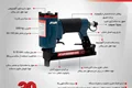 حداکثر فشار باد مجاز :۱۲۰psi یا ۸.۳bar سبک و پرقدرت با طراحی حرفه ای مجهز به سنبه سخت کاری شده سرعت منگنه کوبی بالا مجهز به دماغه نازک و منحصربفرد به منظور کوبش دقیق و آسان منگنه قابلیت پر کردن سریع و آسان خشاب با ظرفیت ۱۰۰ منگنه طراحی ضامن خشاب از داخل به منظور استفاده از ابزار با یک دست قابلیت منگنه گذاری از زیر به منظور جلوگیری از گیر کردن منگنه دسته ارگونومیک با پوشش ضدتعریق قابلیت استفاده از منگنه سری ۸۰ دارای شیلنگ فنری با کیفیت به همراه ابزار