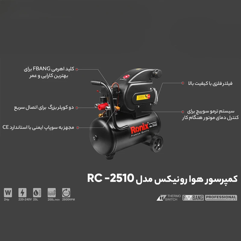 - مجهز به کلید LEFCO جهت عملکرد بهتر و عمر طولانی دستگاه - دارای دکمه ری استارت جهت حفاظت از موتور دستگاه - دارای فیلتر هوای فلزی - سبک و کم حجم جهت حمل و نقل سریع و آسان نسبت به محصولات هم ردهی خود - امکان پر شدن مخزن هوا در حداقل زمان - توان: ۲ اسب بخار - حداکثر فشار: ۸ بار - دارای سوپاپ اطمینان با استاندارد CE - دارای ۲ عدد خروجی از نوع کوپلر جهت اتصال سریع